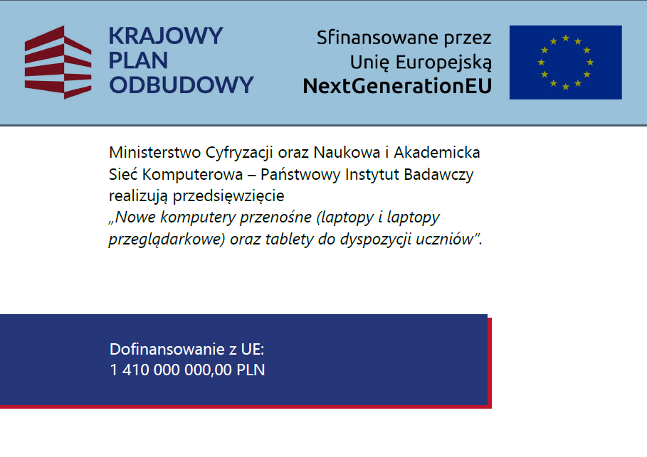 Gmina Halinów realizuje projekt w ramach Krajowego Planu Odbudowy i Zwiększania Odporności (KPO) pn. „Wdrażanie inwestycji C 2.1.2 – Wyrównywanie poziomu wyposażenia szkół w przenośne urządzenia multimedialne – inwestycje związane ze spełnieniem minimalnych standardów sprzętowych”, wskaźnik C15G Nowe komputery przenośne (laptopy i laptopy przeglądarkowe) do dyspozycji uczniów.